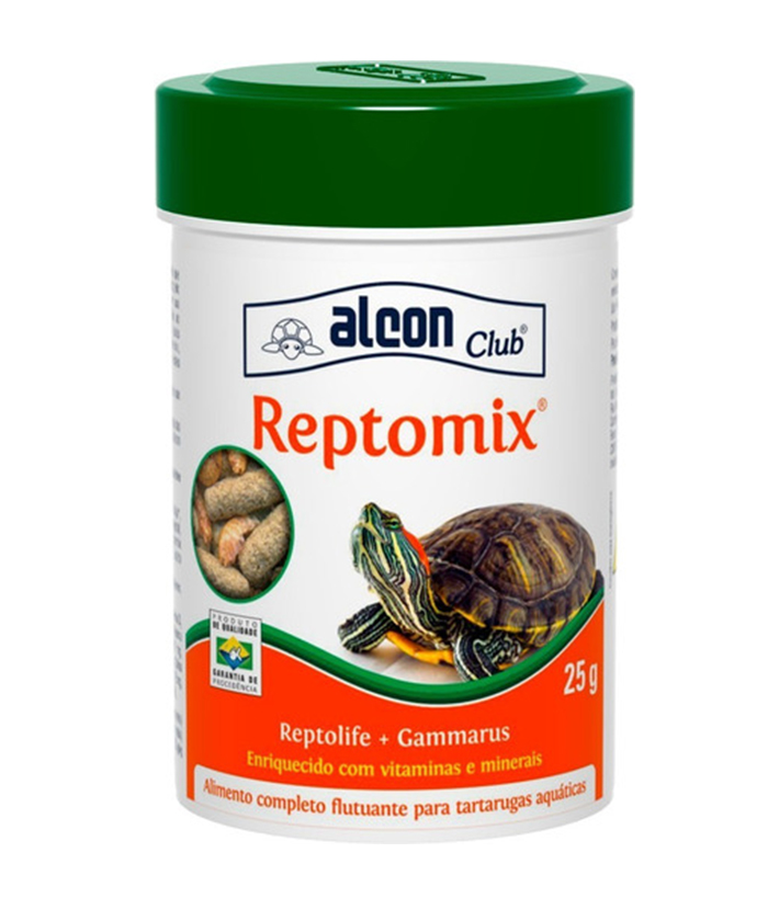 Ração Alcon Club Reptomix 25g é um alimento completo para tartarugas aquáticas, formado pelo alimento extrusado em bastões Alcon
