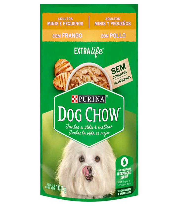 A Ração Úmida Nestlé Purina Dog Chow Sachê Frango para Cães Adultos Raças Minis e Pequenas é prática e já vem pronta para