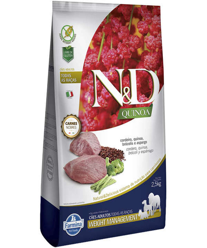 A Ração Farmina N&D Quinoa Weight Management Cordeiro para Cães Adultos de Todas as Raças conta com fórmula italiana, um