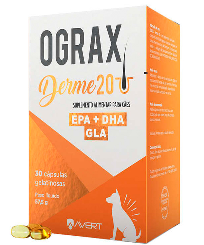 O Suplemento Alimentar Avert Ograx Derme 20 para Cães é indicado para a pele e pelagem de cães e gatos que necessitem do aporte desses nutrientes.