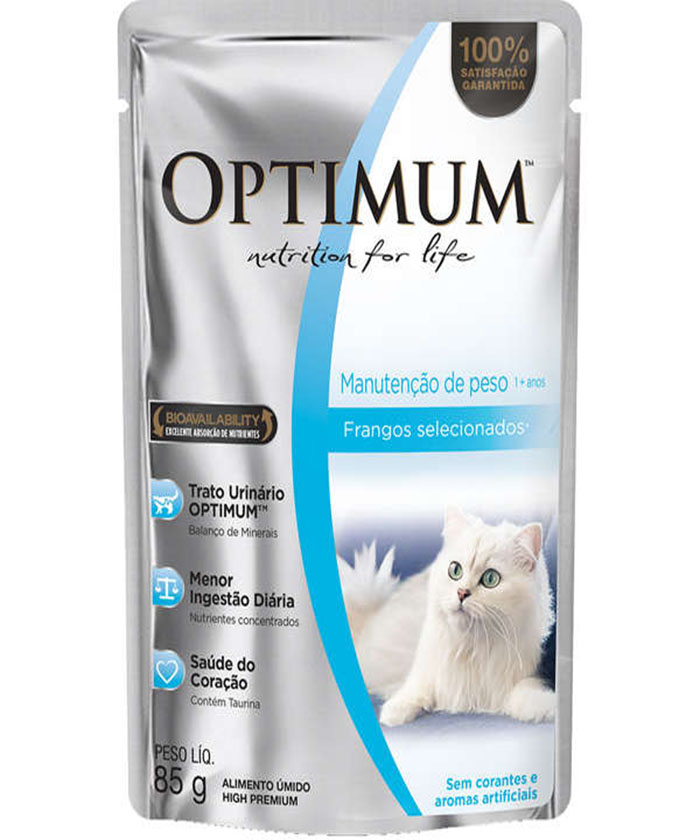 A Ração Optimum Sachê Manutenção de Peso Frango para Gatos Adultos é completa pois possui todos os nutrientes que o gato precisa. Funcional pois garante parte do consumo de água diário, essencial para a saúde do animal. O que o gato consome em cada etapa de vida tem resultado direto em seu crescimento, força e bem-estar. Por isso OPTIMUM™ sachê foi desenvolvido usando as melhores matérias-primas, proteínas cuidadosamente selecionadas e nutrientes essenciais. Experimente misturar sachê com alimento seco. Pesquisas indicam que misturar alimentos úmidos e secos traz inúmeros benefícios à saúde do felino.